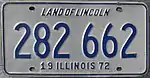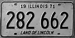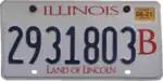 The new multiyear baseplate, which began to be issued in July 2001, was the first fully graphic passenger plate issued by the state of Illinois. The design, dark red characters on a background that faded from white at the top to dark blue at the bottom, was chosen by Internet voters from among nine different designs. The word "Illinois" was centered in a script font at the top, the "Land of Lincoln" slogan was once more centered at the bottom of the plate, and a single sticker well, half the size of the former well, was at the top right corner. In the center of the plate was a silhouette of Abraham Lincoln. Approximately 8.5 million passenger plates were scheduled to be replaced in a single year although replacement plates for all vehicle types was scheduled to take place over three years.[19][20] Approximately 6.5 million passenger plates were made in Illinois at Macon County Rehabilitation Facilities, Inc. in Decatur, and another 2 million plates were made by Waldale Manufacturing Ltd. of Amherst, Nova Scotia, Canada in order to produce all of the passenger plates needed in a single year.[21]