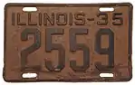 1935 Blue on white with border line; "ILL-35", "ILLINOIS-35" or "ILLINOIS-1935" at top none 1-234-567 1 to approximately 1-351-000 Plates with serials 1 through 999 had "ILL-35" at the top; plates with serials 1000 through 9999 had "ILLINOIS-35"; and plates with serials 10-000 and up had "ILLINOIS-1935".