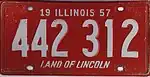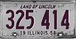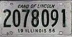 In 1956, the United States, Canada, and Mexico came to an agreement with the American Association of Motor Vehicle Administrators, the Automobile Manufacturers Association and the National Safety Council that standardized the size for license plates for vehicles (except those for motorcycles) at 6 inches (15 cm) in height by 12 inches (30 cm) in width, with standardized mounting holes.[2] The 1956 (dated 1957) issue was the first Illinois license plate that fully complied with these standards: the 1955 (dated 1956) issue was 6 inches in height by 12 inches in width, but had non-standard mounting holes.