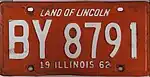 67. "White, Orange To Be License Colors In 1962". Chicago Tribune. July 25, 1961. p. B5. The secretary of state's office said the color combination was chosen from a list of 22 recommended by the University of Illinois engineers who prompted the change this year to the numeral-letter system. . . . The colors are not those of a college or university as has been the custom of recent years. No college or university requested its colors be used in 1962.
