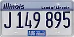 Black serial number on white background 1A234 1A100 to ? This is only the second type of Illinois plate to intermingle numbers and letters. The other type is the Temporary Registration Permit.
