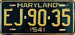 1940–41 Embossed white serial on dark blue plate with border line; "MARYLAND EX-3-31-41" at top none 123-456 30-000 to approximately 544-000