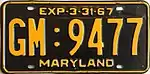 1966–67 Embossed golden yellow serial on black plate with border line; "EXP-3-31-67" and "MARYLAND" centered at top and bottom respectively none AB:1234 AA:1001 to approximately GZ:9000