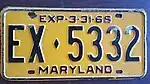 1965–66 Embossed black serial on golden yellow plate with border line; "EXP-3-31-66" and "MARYLAND" centered at top and bottom respectively none AB♦1234 AA♦1001 to approximately GP♦7800