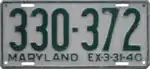 1939–40 Embossed green serial on white plate with border line; "MARYLAND EX-3-31-40" at bottom none 123-456 30-000 to approximately 522-000