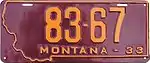 1933 | Embossed orange serial on maroon plate with state-shaped border; "MONTANA–33" below serial | none | 12-345 | 1 to approximately 83-000 | |