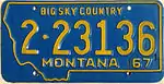 1967 | Embossed yellow serial on light blue plate with state-shaped border; "MONTANA 67" below serial | "BIG SKY COUNTRY" centered at top | 1·12345 10·1234 |