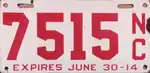 1913–14 | Red serial on white porcelain plate; vertical "NC" at right and "EXPIRES JUNE 30-14" at bottom | none | 12345 | 1 to approximately 13000 | Issued to all registrants. |