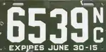 1914–15 | White serial on green porcelain plate; vertical "NC" at right and "EXPIRES JUNE 30-15" at bottom | none | 12345 | 1 to approximately 17000 | |