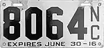 1915–16 | Black serial on gray porcelain plate; vertical "NC" at right and "EXPIRES JUNE 30-16" at bottom | none | 12345 | 1 to approximately 25000 | |