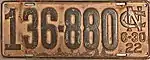 1920–21 | Embossed white serial on brown plate; white lines at top and bottom borders; "NC" monogram and "6-30 1921" at right | none | 123-456 | 1 to approximately 131-000 | |