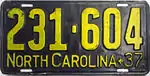1937 | Embossed yellow serial on black plate; "NORTH CAROLINA–37" at bottom | none | 123-456 | 200-001 to approximately 651-000 | Serials 100-001 through 200-000 reserved for trucks; this practice continued through 1946.[4] |