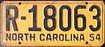 1954 | Embossed black serial on golden yellow plate; "NORTH CAROLINA 54" or "N.C.", slogan and "54" at bottom | none, or "DRIVE SAFELY" between state abbreviation and year | 123-456 | 100-001 to 760-000 |