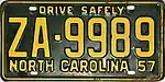 1957 | Embossed golden yellow serial on black plate with border line; "NORTH CAROLINA 57" at bottom | "DRIVE SAFELY" centered at top | A-1234 AB-1234 |