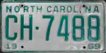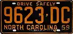 1959 | As 1957 base, but with "NORTH CAROLINA 59" at bottom | "DRIVE SAFELY" as on 1957 base | A-1234 AB-1234 |
