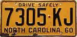 1960 | As 1956 base, but with "NORTH CAROLINA 60" at bottom | "DRIVE SAFELY" as on 1956 base | A-1234 AB-1234 |