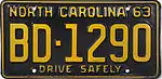 1963 | Embossed golden yellow serial on black plate with border line; "NORTH CAROLINA 63" at top | "DRIVE SAFELY" centered at bottom | A-1234 AB-1234 |