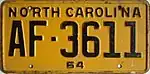 1964 | Embossed black serial on golden yellow plate; "NORTH CAROLINA" at top; "64" centered at bottom | none | A-1234 AB-1234 |