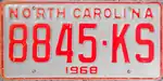1968 | Embossed red serial on reflective white plate with border line; "NORTH CAROLINA" at top; "1968" centered at bottom | none | A-1234 AB-1234 |