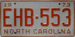 1973 | Embossed red serial on reflective white plate with border line; "19" at top left and "73" at top right; "NORTH CAROLINA" at bottom | none | ABC-123 | AAA-101 to approximately HVA-999 | |