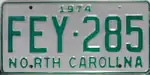 1974 | Embossed green serial on reflective white plate with border line; "1974" centered at top; "NORTH CAROLINA" at bottom | none | ABC-123 | AAA-101 to approximately JBA-999 |