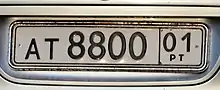 The modern Russian number was taken as a sample of the first Tajik numbers with the only difference - in the window of regional affiliation, instead of the code "RUS" and the Russian flag, the letter combination "RT" was written in small letters, there was no flag.