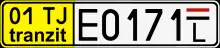 Reminiscent of modern Russian transit numbers, but mirrored. On the left, in a separate window, information is applied in black on yellow in 2 rows: the top row is the registration region code and the combination “ TJ ”, the bottom row is the word “ tranzit ”. In the rest of the letter, four numbers and one more letter are applied in black and white. Since 2014, the appearance of the sign has changed slightly: the first letter has become the same size as the numbers, and the flag of Tajikistan has been drawn above the last letter. See notes.