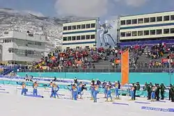 During the 2002 games, Snowbasin hosted the downhill, combined (downhill and slalom), and super-G events. The spectator viewing areas consisted of a stadium at the foot of the run, with two sections of snow terraces for standing along both sides of the run.[31] The spectator capacity was 22,500 per event; 99.1 percent of tickets were sold, and 124,373 spectators were able to view events at the Snowbasin Olympic venue.[32] During the 2002 Winter Paralympics, Snowbasin hosted the Alpine Skiing events, including downhill, super-G, slalom, and giant slalom.[33]