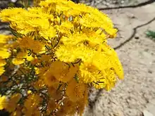 The flowers are honey-scented and arranged in corymb-like groups near the ends of the branches, each flower on an erect stalk 12–20 mm (0.5–0.8 in) long. The floral cup is shaped like half a sphere, about 2 mm (0.08 in) long, glabrous and has a slightly warty surface. The sepals are bright yellow, spreading, 5 mm (0.2 in) long, with 7 to 9 densely hairy lobes. The petals are also bright yellow, erect 5 mm (0.2 in), with long, spreading, finger-like projections. The stamens possess an inflated appendage, a hood, that nearly covers their tips and the staminodes are pointed and triangular. The style is straight, 2.5–3.7 mm (0.098–0.15 in) long, and glabrous. Flowering time is from September to November.[2]