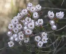 The flowers are arranged in rounded or corymb-like groups near the ends of the long flowering stems, each flower on an erect stalk, 6–13 mm (0.2–0.5 in) long. The floral cup is about 1.5 mm (0.06 in) long and covered with short, soft hairs. The sepals are white, sometimes pale pink, spreading but curving upwards, 3–4 mm (0.1–0.2 in) long, with 8 to 12 hairy lobes and two ear-shaped, hairy appendages on the sides. The petals are the same colour as the sepals, egg-shaped to almost round, 2.5–5 mm (0.1–0.2 in), spreading with a smooth edge and are joined with the ring of stamens and staminodes, to form a short tube. The style is less than 0.5 mm (0.02 in) long, straight and glabrous. Flowering time is from September to December.[3]
