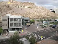 The Tempe Transportation Center facilities are a combination of a light rail station, bus transfer stations and a mixed use building all in the shadow of A Mountain. The main building is composed of three stories with retail space, a transit information center and Arizona's first Bike Station all located on the first floor. The second floor is home to the offices for the City of Tempe Transportation Department Offices and the signature element of the project, the Don Cassano Community Room which is open on the ground level to provide shading for pedestrians passing by. On the third floor of the building are leasable office space and the City of Tempe's Transit Operations Center.[2] The center was designed by the Tempe-based firm Architekton with Portland, OR based OTAK Inc. and is currently under review for LEED v2.2 Platinum Certification.[3] The majority of the outdoor area on the site is covered with water-permeable pavers for natural drainage. Solar panels on the green roof are designed to reduce the heat island effect with local plants to help insulate the building.[4]