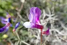 Vicia palaestina, the Palestine vetch, is a species of flowering plant in the family Fabaceae. It is native to the eastern Mediterranean region; Greece, the Aegean Islands, Turkey, Cyprus, the Levant, Sinai, and Iraq.[1] Carbonized remains of its seeds have been tentatively identified in Mousterian Neanderthal deposits in Kebara Cave, Mount Carmel, Israel.[2] Unlike many species of vetch, its seeds are non-toxic, and are edible even when raw.[3]