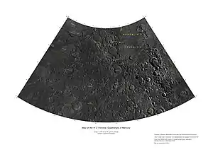 Most of the Victoria quadrangle lies within an area that appears bright on telescopic images of the planet, the bright-albedo feature Aurora, which approximately coincides with the east half of the quadrangle.[1] As is common with most of the imaged portions of Mercury, the Victoria quadrangle is dominated by basins and large craters, with plains materials occupying the areas between them.