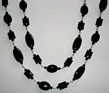 Throughout the mourning period, there were two main materials that became frequently sourced in jewellery. In order to keep up with the demand for these materials sourced in mourning jewellery, imitations of these materials were discovered.[9] Some of these imitations include hardened rubber also known as “french jet”, black enamel and black glass.[9] The two main materials used to create mourning jewellery consisted of jet and black onyx jewels.[9][11]