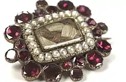 The symbol of eyes had a powerful significance in mourning jewellery.[3] A single eye was often included in jewellery such as brooches.[3] An eye signified a spiritual presence of the departed with the person who wore the jewellery, in this way the departed could watch over the person who was wearing the jewellery. Another element often incorporated into jewellery were pearls which represented tear drops.[3] The fashion of mourning jewellery gradually declined in 1901 following the death of Queen Victoria.[9]