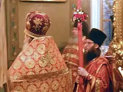 A deacon holds a red paschal deacon's candle at paschal matins (The Trinity Lavra, in Sergiyev Posad, Russia).