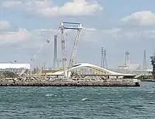 The first of the bridges to be placed, the transit and pedestrian span over the Keating channel