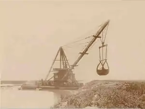 The city had also canalized and straightened the lower reach of the Don River, so it flowed straight for 5 kilometres (3.1 mi) from Bloor/Danforth to what is now Lake Shore Boulevard, where it made a right hand turn and ran 1 kilometre (0.62 mi) west into the Keating Channel.[19] This right-hand turn caused a significant build-up of silt and debris that had to be removed by the port authorities regularly to minimize flooding of the surrounding area after a storm.
