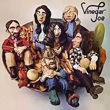 Vinegar Joe evolved out of Dada, a 12-piece Stax-influenced, jazz/blues rock[2] fusion band. Dada released one eponymous album in 1970, with a line up including vocalist Elkie Brooks and guitarist Pete Gage.[3] Singer Robert Palmer, formerly with The Alan Bown Set joined Dada after the album had been recorded. Dada were signed by Ahmet Ertegun for Atlantic Records. After their US tour, Ahmet sub-licensed them to Chris Blackwell of Island Records for the UK and rest of the world, with instructions to reduce the line up to form Vinegar Joe in 1971, adding keyboard player Dave Thompson, but the band was still without a drummer. Phil Collins had unsuccessfully applied for the job.[4] Conrad Isidore[5] and Rob Tait drummed on the first album. Tim Hinkley added keyboards alongside Dave Thompson and it was Hinkley who appeared on the cover of the first album. Their debut LP Vinegar Joe was released in April 1972 on Island Records in the UK and Atco Records in the US.[3][6] The album cover featured plasticine models of the band created by John Padley.[7]