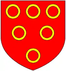 Vipont (alias Vieuxpont) is the name of a prominent family in the history of Westmorland. According to Thomas [1] the name originated in France before 1066 as Vieuxpont ("Old Bridge"), Latinized to de Vetere Ponte ("from the Old Bridge"), with alternative spellings Vezpont, Veepon, Vexpont, Vypont, Vispont, Vypunt, Vespont, Vipond, Vypond, Voypond, Veepond, Vippond, Vipon, Vipan, Vipen, etc. The Vipont family bore arms: Gules, six annulets or 3:2:1, later quartered by Baron Clifford.
