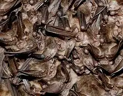 White-nose syndrome (WNS) is one of the worst wildlife diseases in recent history that is currently decimating North American cave-hibernating bat populations.[26] This epidemic is responsible for mass mortalities in hibernating North American bats, and is caused by a uniquely cold-adapted fungus Pseudogymnoascus destructans. The fungus begins to grow on bats during the winter hibernation season, when bats are in torpor and immune-compromised. The body temperature of a hibernating bat is the optimal fungal growth environment.[26] The fungus has affected 90% of species that hibernate in caves for the winter. Pseudogymnoascus destructans spores have been found growing on the Virginia big-eared bat. To date, no WNS mortality in this species has been observed although the syndrome has killed millions of its fellow cave-dwelling species.[27] It is currently thought that the Big Ears may have a natural immunity to WNS through a yeast that the bat 'combs' over their body that inhibits the growth of the WNS fungus.[28]