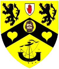 Or on a chevron between two lions rampant in chief and a lymphad in base Sable a bezant charged with a representation of the head of St John the Baptist Proper between two hearts of the field.