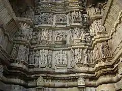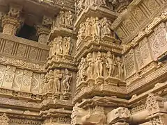 The exterior portion above the base has three bands featuring sculptures of various deities, surasundaris (female figures) such as apsaras, and mythical creatures. The surasundaris are shown performing various day-to-day activities, such as applying sindoor (vermilion powder) to their foreheads and kohl to their eyes, wringing their hair after bathing, playing flute, plucking thorn from their feet, dancing, admiring themselves in a mirror, dressing or simply posing provocatively. Their hairstyles, patterned garments, ornaments and expressive faces are noticeable in these sculptures.[15][19]