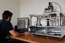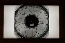 The current version of the scanner is made of a glass rotating plate,[1] on which is placed the film. The digitisation of the image is done by a linear CCD camera of 2048 pixels wide, which takes pictures at regular intervals, with frequencies ranging from 25,000 to 200,000 lines per rotation. The combination of the camera with the rotating film delivers a rotary scan of the record in the form of a rectangular picture of a ring. A second radial movement provides the next ring.[3]