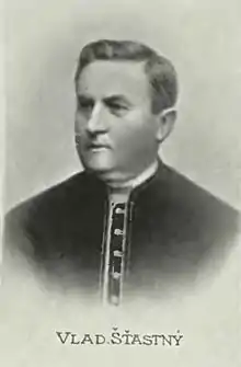 Vladimír Šťastný (17 March 1841, Rudíkov[1] – 20 August 1910, Brno) was a Czech priest and poet. He is also known under the pseudonym Josef Ruda. After studying theology, he was chaplain in Židlochovice and a prefect at the Brno bishop seminary. After that he taught at the 1st Czech Gymnasium in Brno. He was the founder of the magazine Obzor (Horizon) and the chief executive of the Literature association of the heritage of Saint Cyril and Metoděj.[2]