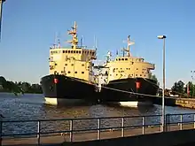 Voima (left) moored next to Apu in 2005. Prior to the refit, her superstructure resembled that of the other icebreaker.