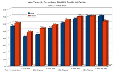 The age difference is associated with youth voter turnout. Some argue that "age is an important factor in understanding voting blocs and differences" on various issues.[11] Others argue that young people are typically "plagued" by political apathy and thus do not have strong political opinions.[12] As strong political opinions may be considered one of the reasons behind voting,[13] political apathy among young people is arguably a predictor for low voter turnout. One study found that potential young voters are more willing to commit to voting when they see pictures of younger candidates running for elections/office or voting for other candidates, surmising that young Americans are "voting at higher and similar rates to other Americans when there is a candidate under the age of 35 years running".[14] As such, since most candidates running for office are pervasively over the age of 35 years,[15] youth may not be actively voting in these elections because of a lack of representation or visibility in the political process.
