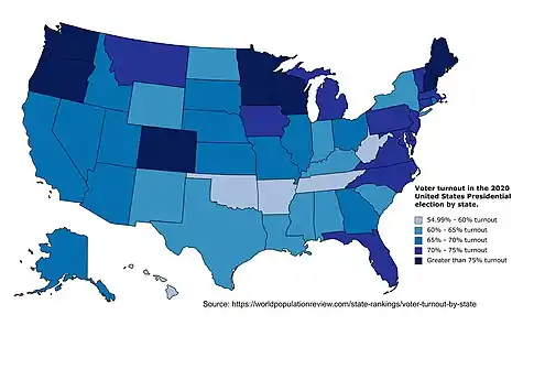 A map of voter turnout during the 2020 United States presidential election by state (no data for Washington, D.C.)