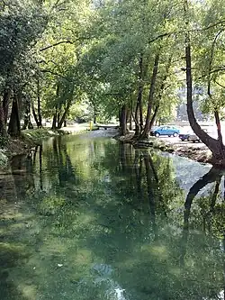 Due to its length (same number of meters as days per year), many call it the "Godina" (Serbian Cyrillic: Година, lit. 'year') and say it's one year long.[3] The river has a strong spring and after its short course it flows into the Drina via a waterfall. Although short, the river has all the characteristics of major rivers – the great, powerful source from which water gushes whitish, a pond on the right bank, water mill on the left, a left tributary in the form of clear creek, a village on the left bank, two bridges.[2][4]