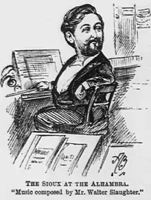Slaughter served as the organist at St. Andrew's and as a cellist and pianist in music halls prior to becoming a musical director in West End theatre productions. Before he was 20, he had composed three ballets for the South London Palace. His early works also included some individual songs, one of which was the popular "The Dear Homeland". He composed the music for the successful all-women one-act opera di camera An Adamless Eden (1882 at the Opera Comique),[5] which was produced in Britain and in America (1884) by Lila Clay's ladies' company. He also provided additional music in 1883, for the English adaptation of Edmond Audran's Gillette de Narbonne.[6] After several one-act works, including Sly and Shy (1883), The Casting Vote (1885)[7] and Marie's Honeymoon (1885), he wrote the score for what became the most successful musical version of Alice in Wonderland, in 1886, to a book and lyrics by Henry Savile Clarke. He also wrote a work called Sappho that year for the Opera Comique, which was not as well received because of a weak libretto.[8]